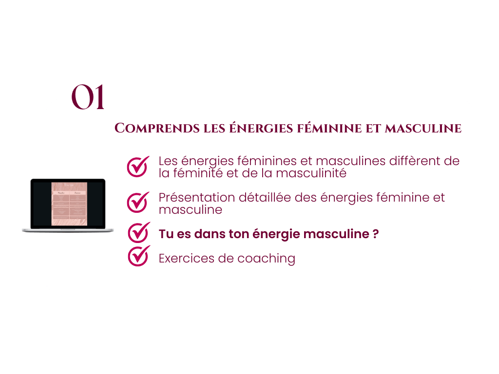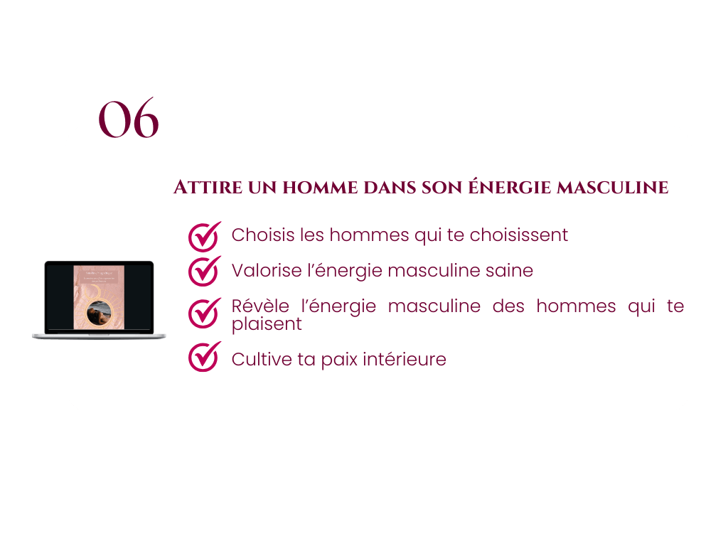 Cette dernière étape te donne les clés pour non seulement développer au quotidien ton énergie féminine, mais aussi, pour magnifier l’énergie masculine des hommes que tu vas attirer de plus en plus à toi.
