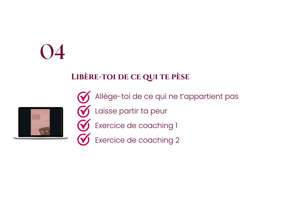 Il est important que tu suives les modules dans l'ordre dans lesquels ils tes sont offerts, et surtout en suivant le rythme auquel ils sont proposés. Les modules se débloquent de semaine en semaine pour permettre à chaque exercice de faire effet sur toi.