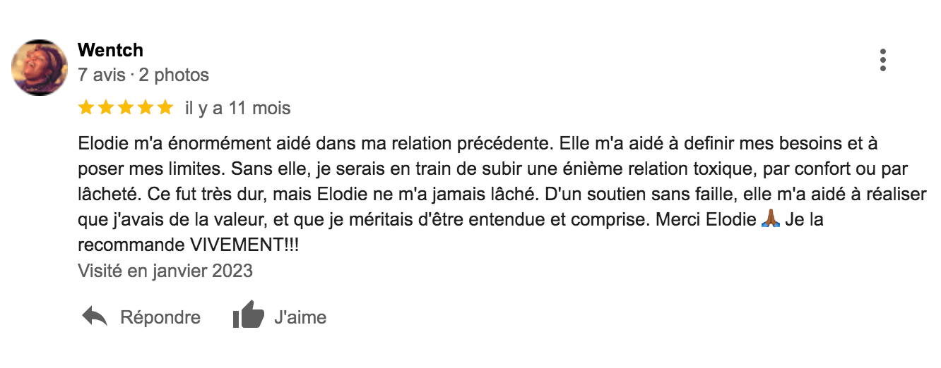 Depuis, ma vie amoureuse de déroule dans une dynamique d'énergies où je me sens dans mon énergie féminine, et attire des hommes dans leur énergie masculine. Ils sont confiants, force de proposition, généreux, ont envie de prendre soin...